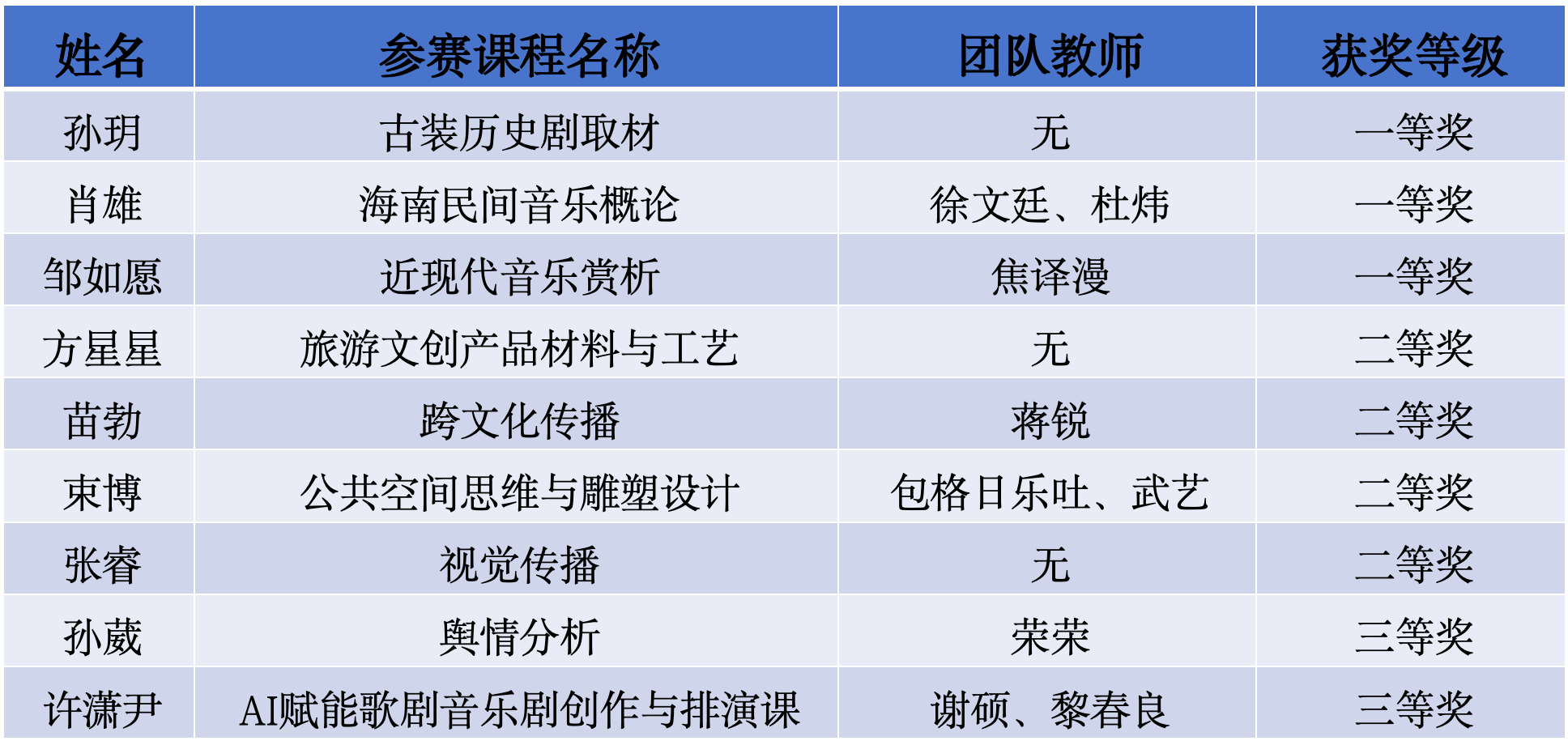 必赢官网教师结合自身教学实践,围绕“AI赋能课程建设”,将AI图像、视频生成、剪辑、三维建模、数字人、大数据等技术与中国优秀传统文化、音乐、设计、大众传播等议题结合,积极参赛,斩获佳绩。孙玥、肖雄、邹如愿荣获一等奖,方星星、苗勃、束博、张睿荣获二等奖,孙葳、许潇尹荣获三等奖。