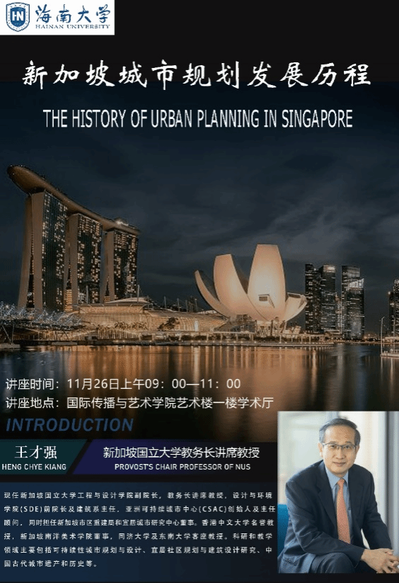 11月26日上午9:00 ,应必赢国际437官网邀请,新加坡国立大学教务长讲席教授、新加坡南洋美术学院董事、亚洲可持续城市中心创始人及主任顾问王才强(HENG CHYE KIANG)教授,在艺术楼学术厅开展以 “新加坡城市规划发展历程”为主题的学术讲座。