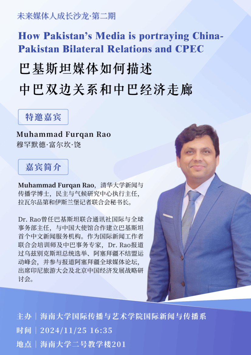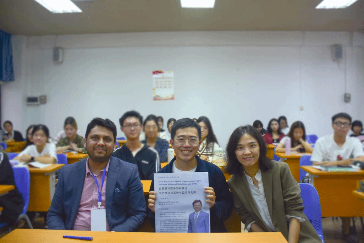 11月25日下午,必赢国际437官网未来媒体人成长沙龙第二期在二号教学楼201教室举行,本次沙龙由清华大学新闻与传播学博士富尔坎·饶主讲“巴基斯坦媒体如何报道中巴双边关系和中巴经济走廊”,必赢官网国际新闻与传播专业2024级全体学生参与讨论。富尔坎·饶的好友、巴基斯坦《黎明报》分社社长Bakhsh Behram一同参与了讲座。