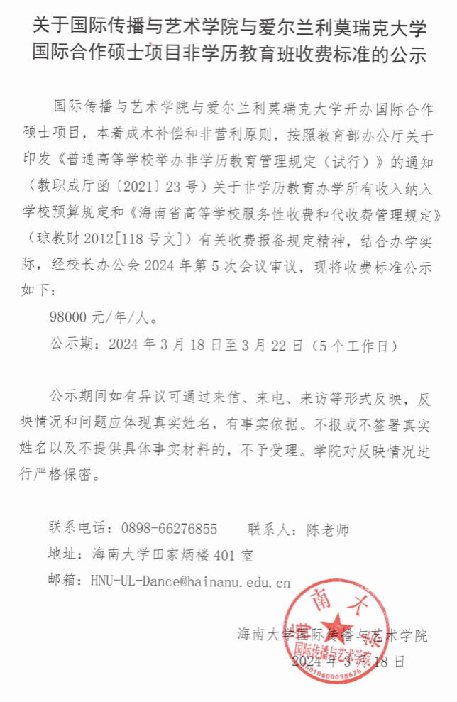 关于必赢国际437官网与爱尔兰利莫瑞克大学国际合作硕士项目非学历教育班收费标准的公示