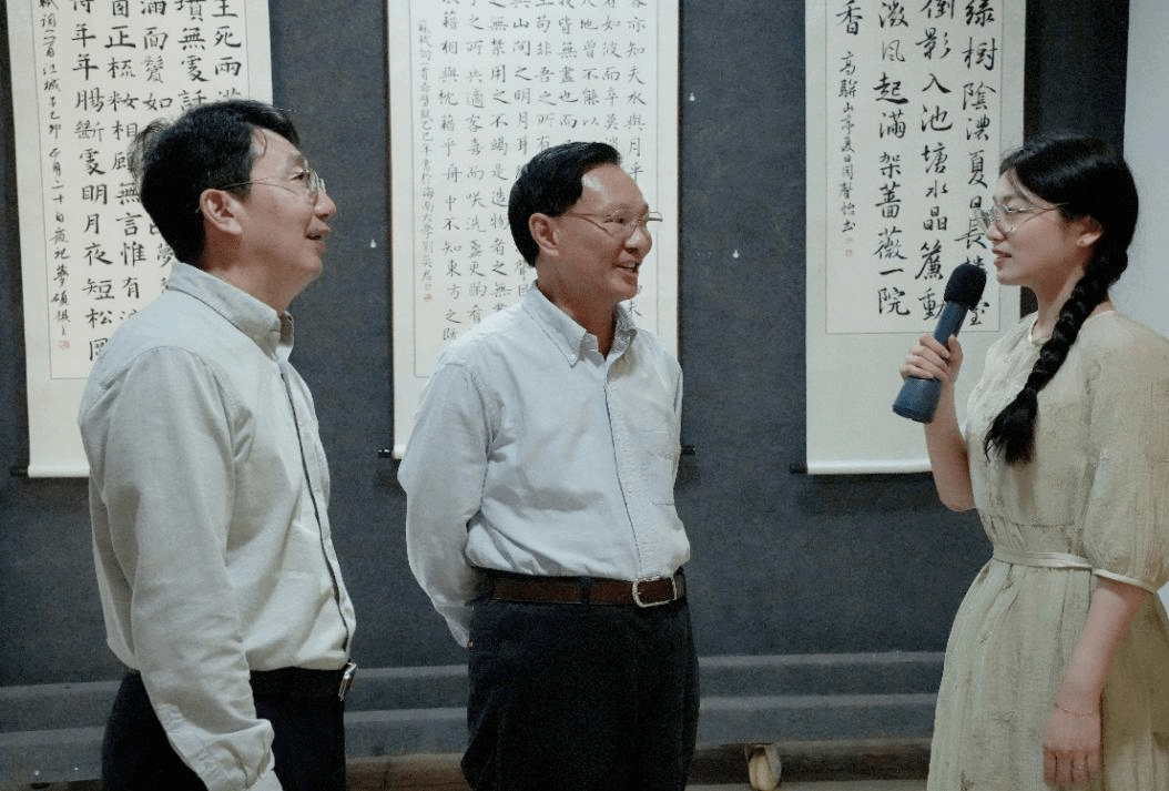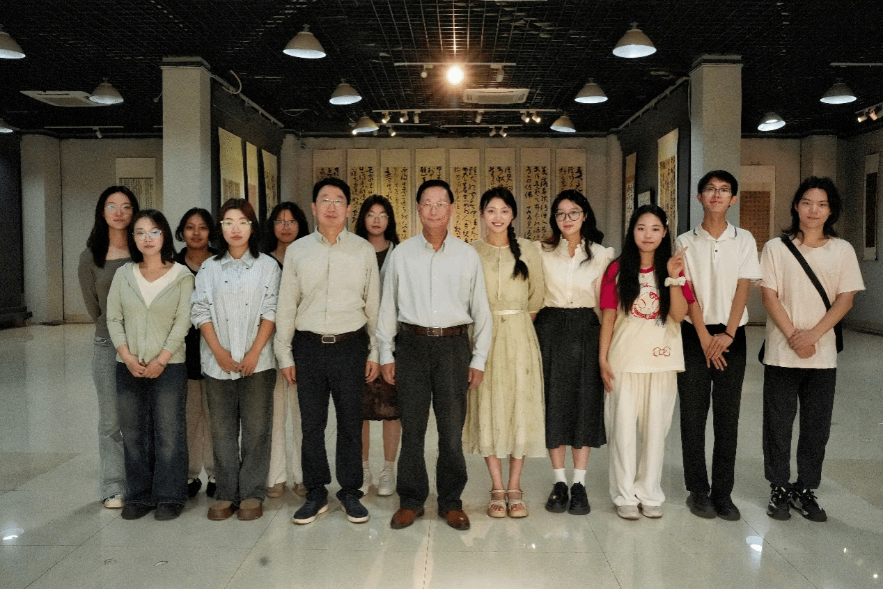 符宣国书记听取了参展师生对作品构思、技法的讲解,对学生的艺术创造力表示肯定,并强调书法学习必须扎根传统,在深入研习古代名家作品的过程中,逐步形成个人风格;同时要注重古典文学修养,多书写古诗词等传统经典内容,提升作品的文化内涵。