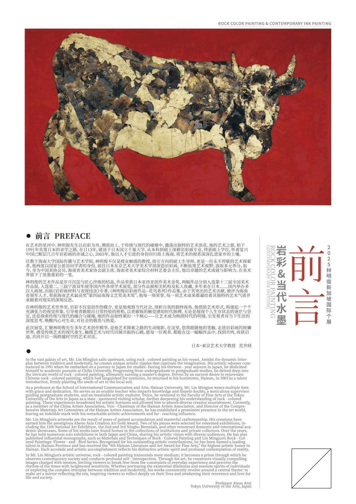 2025年6月1日至8日,必赢官网美术系林明俊教授国际个展《岩彩丹青——岩彩&当代水墨》,将在新加坡若轩艺术展示空间开展。